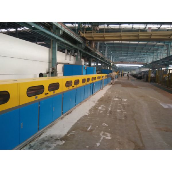Pay off → Pinch rolls set No. 1 → HV-Straightener → Pinch rolls set No. 2 → Cleaning unit → Induction Quenching No.1 → Induction Quenching No.2 → Induction Quenching No.3 →Heat holding → Jet-cooling for Quenching → Induction Tempering →Heat holding → Jet-cooling for Tempering → Flaw detector → Pinch rolls set No. 3 → Oiler → Shearing → Wire separating → Wire take-up